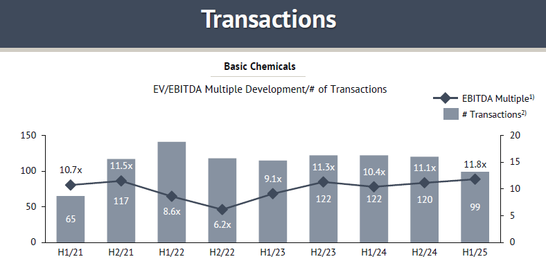 At the same time, the sector remains exposed to persistent structural headwinds. Regulatory requirements, rising input costs, and trade frictions – particularly U.S. tariffs – are compressing margins and weighing on broader market sentiment. Against this backdrop, H1/25 highlights a disciplined M&A environment, where buyers are cautious on volume but willing to pay a premium for differentiated Basic Chemicals platform.