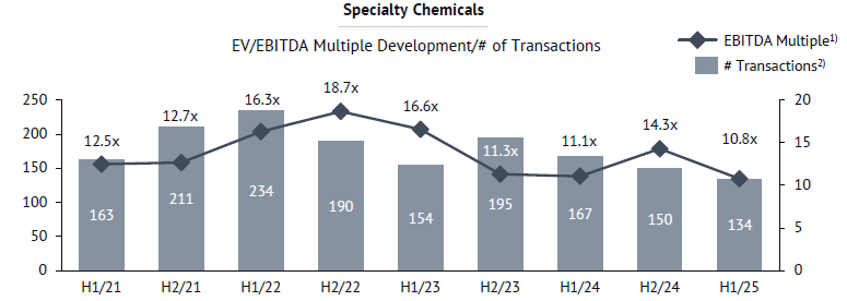 In H1/25, median EV/EBITDA multiples in the Specialty Chemicals sector declined, marking a sharper correction compared to the relative stability observed in 2024. With 134 deals announced, activity remained lower versus H2/24. The median multiple decreased to 10.8x, the lowest level since 2021, pointing to a more cautious valuation environment.