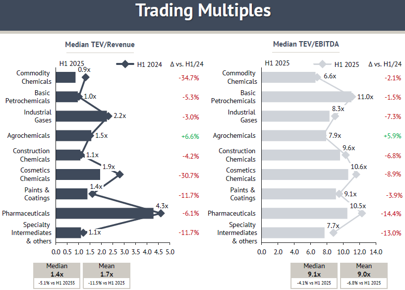 Construction Chemicals and Specialty Intermediates also reported declines across both valuation metrics, pointing to weaker building activity and softer demand in industrial supply chains. These results underline that the pressure on trading multiples is broad-based, sparing only a few of more resilient subsectors.